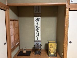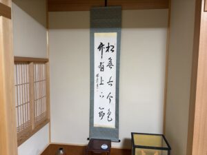 掛け軸をかけて、お客さまをお迎えする準備をしています。
