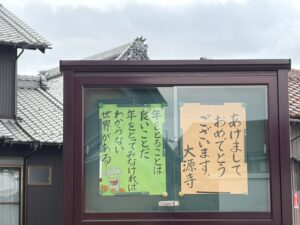 北側の入り口の掲示板を、お正月の仕様に替えました。