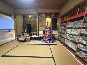 こちらの藤村紫園ご住職とは、親しくさせていただいています。本堂が修復工事をされていて、庫裡の仏間で法要が行われていました。