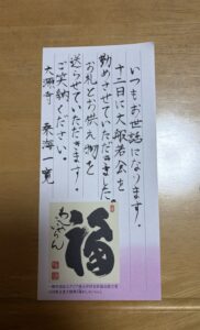 レターパックでお送りするお宅には、下手な字で添え書きをしました。「福わしゃいらん」と福を皆様にお分けする今の気持ちにピッタリでした。