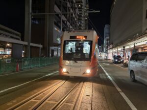 福井駅の付近で食事をしようと車で向かうと、路面電車や恐竜が出迎えてくれました。甥っ子は恐竜好きで喜びます。