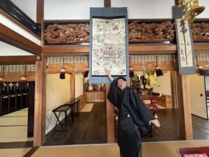 本堂にご案内すると、高いご見識で私を教導してくださいました。本堂正面に涅槃図を掛けているのですが、即興で絵解きをしてくださいました。あまり涅槃図の構成を理解していないのですが、西川上人がわかりやすく教えてくださいました。